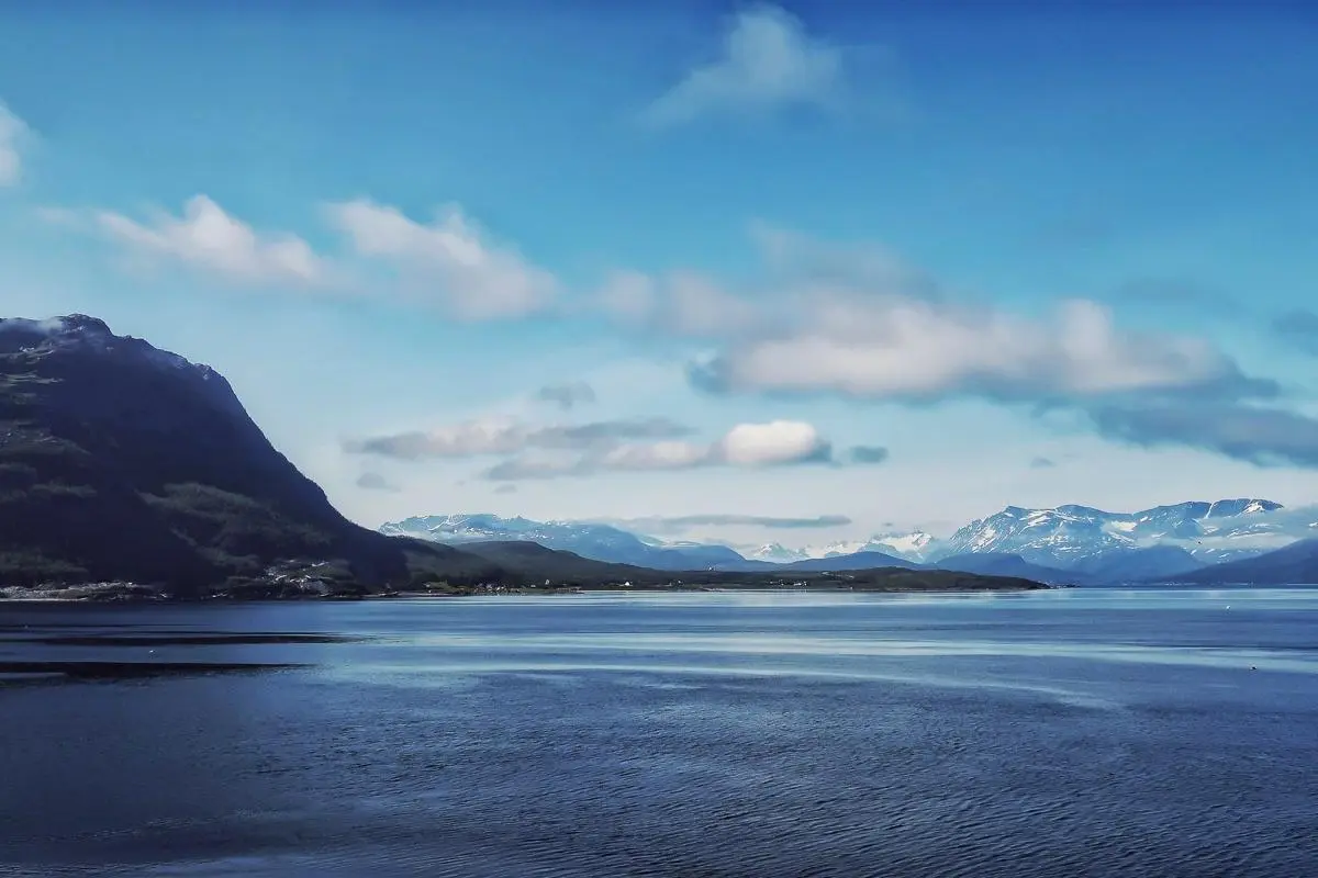 Berglandschaft mit Fjord und bewaldeten Hängen unter blauem Himmel