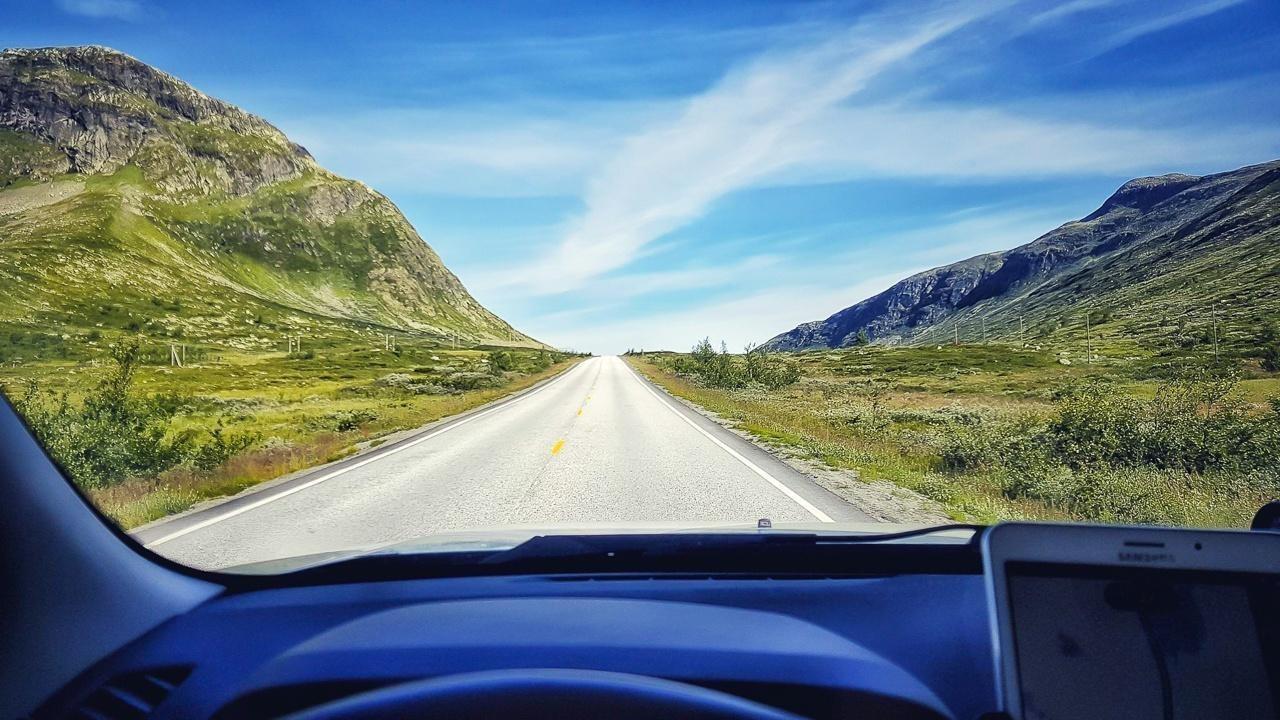 Blick auf eine gerade Straße zwischen Bergen und grünen Wiesen
