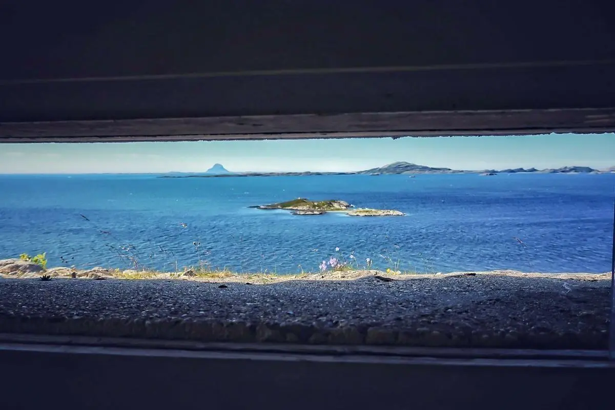 Blick durch einen schmalen Spalt auf eine Küstenlandschaft mit Inseln und Wasser