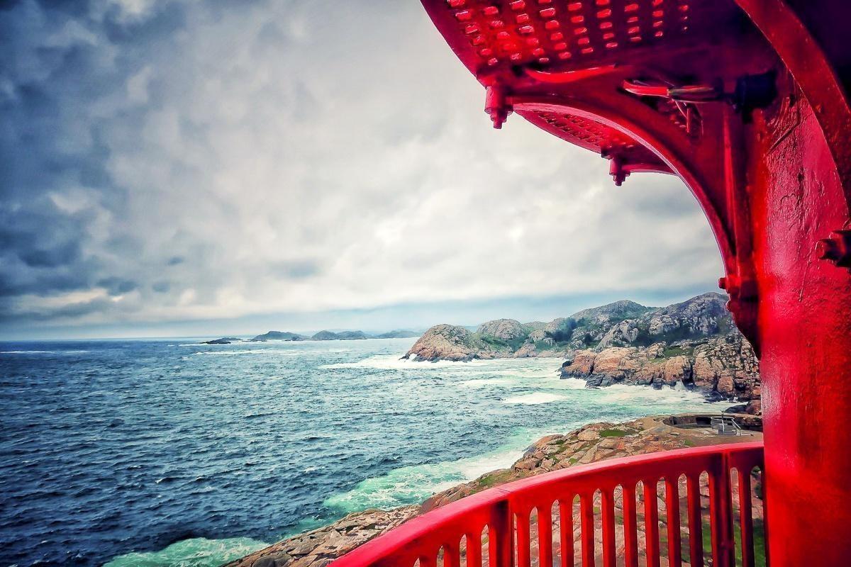 Blick von einer roten Aussichtsplattform auf das Meer und die Küste