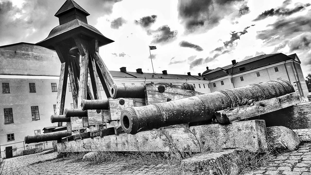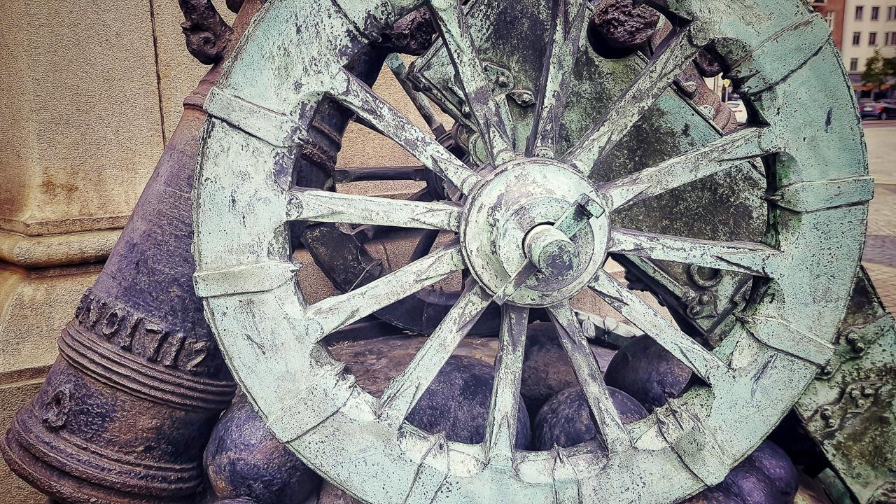Bronzene Radkonstruktion mit Kanonen und Kugeln im Hintergrund