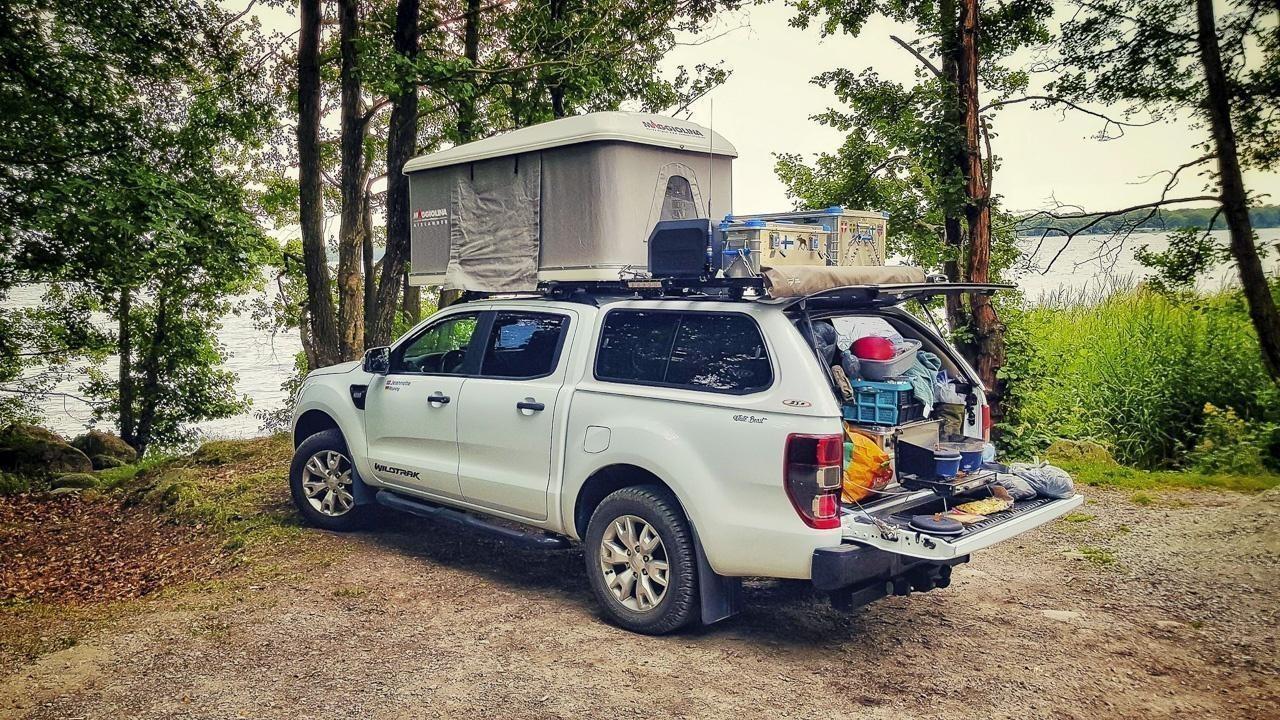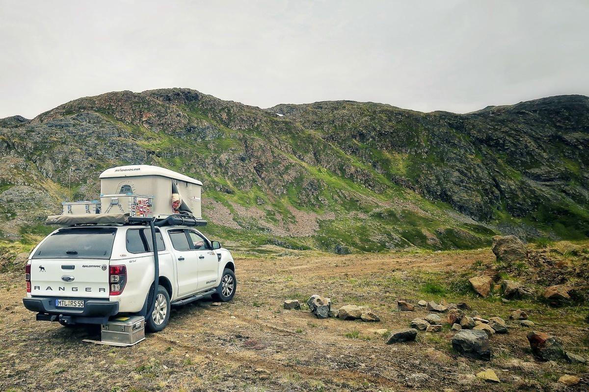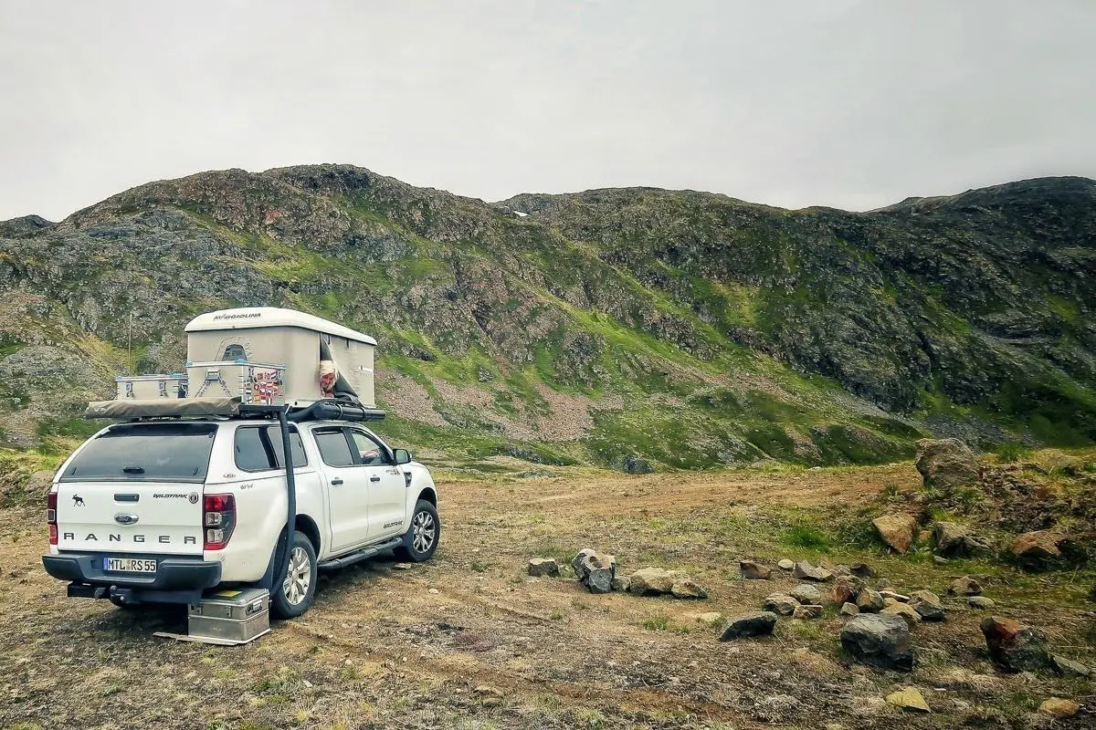 Ein geländegängiger Pickup mit Dachzelt steht auf einer Wiese vor einer Berglandschaft