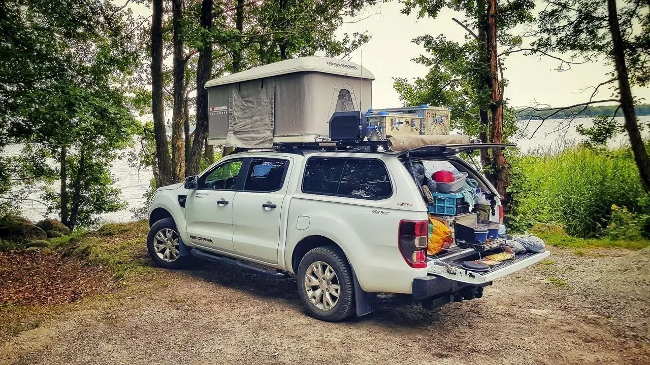 Campingfahrzeug mit Dachzelt und Ausrüstung am Ufer eines Gewässers