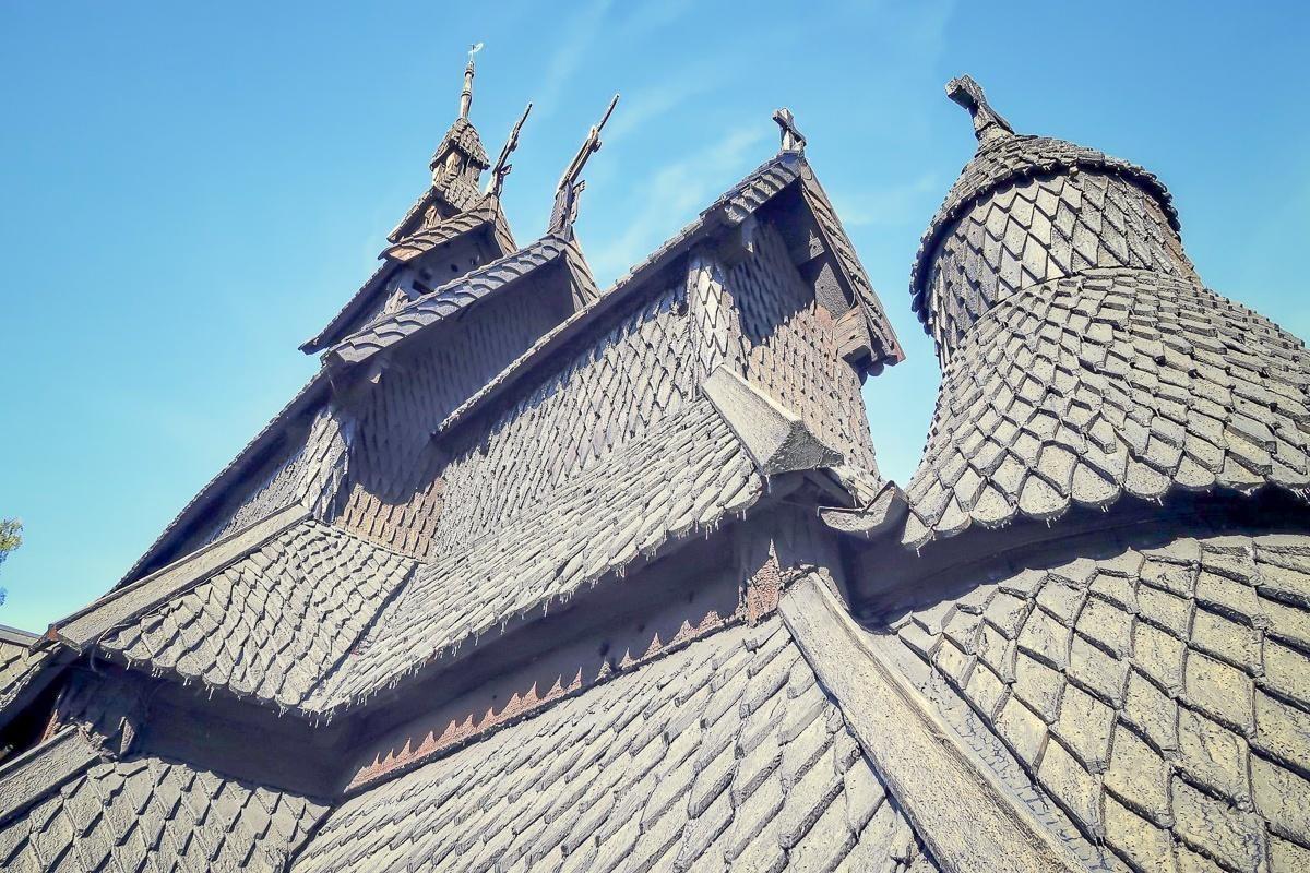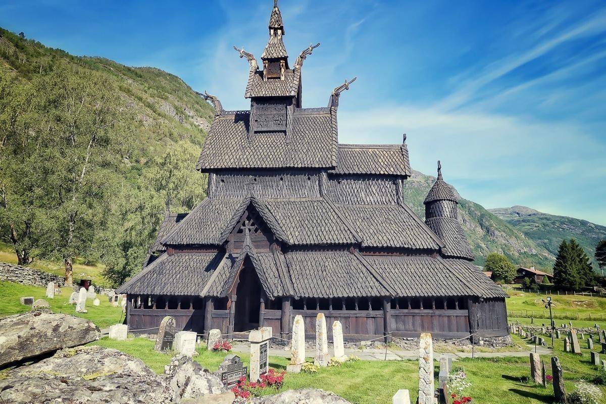Holzkirche mit spitzen Dächern und umliegenden Grabsteinen in einer grünen Landschaft