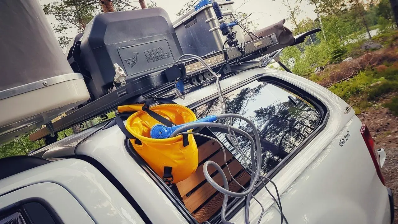 Diverse Ausrüstungsgegenstände auf dem Dach eines Fahrzeugs, darunter ein gelber Behälter und Schläuche