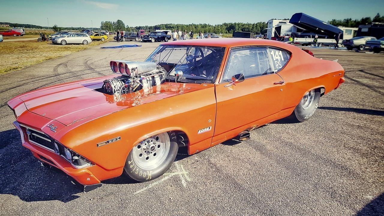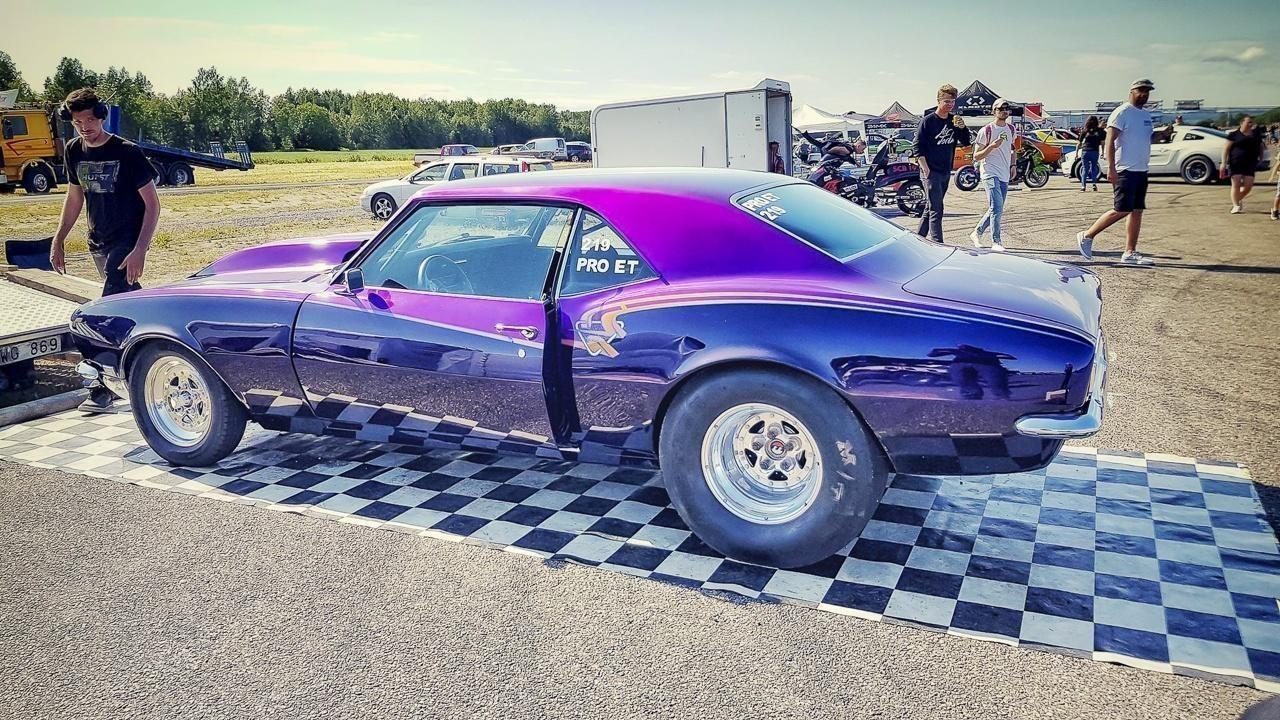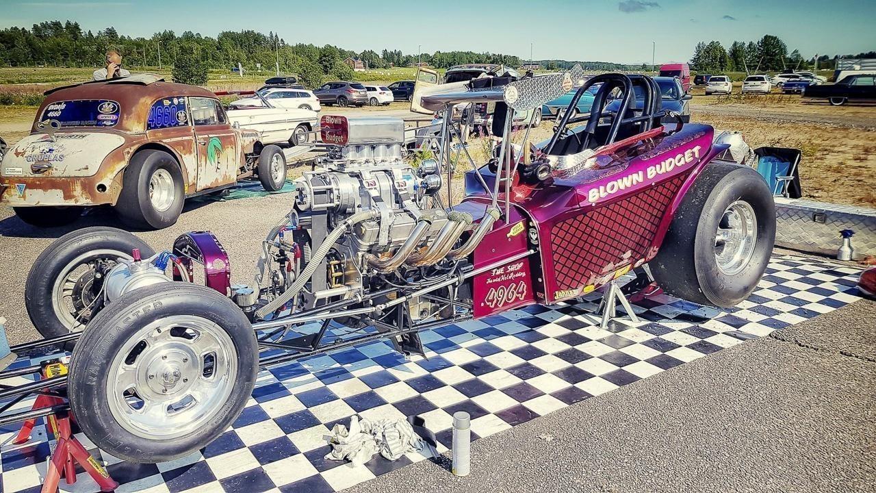 Dragster mit leistungsstarkem Motor und auffälliger Lackierung auf Rennstrecke
