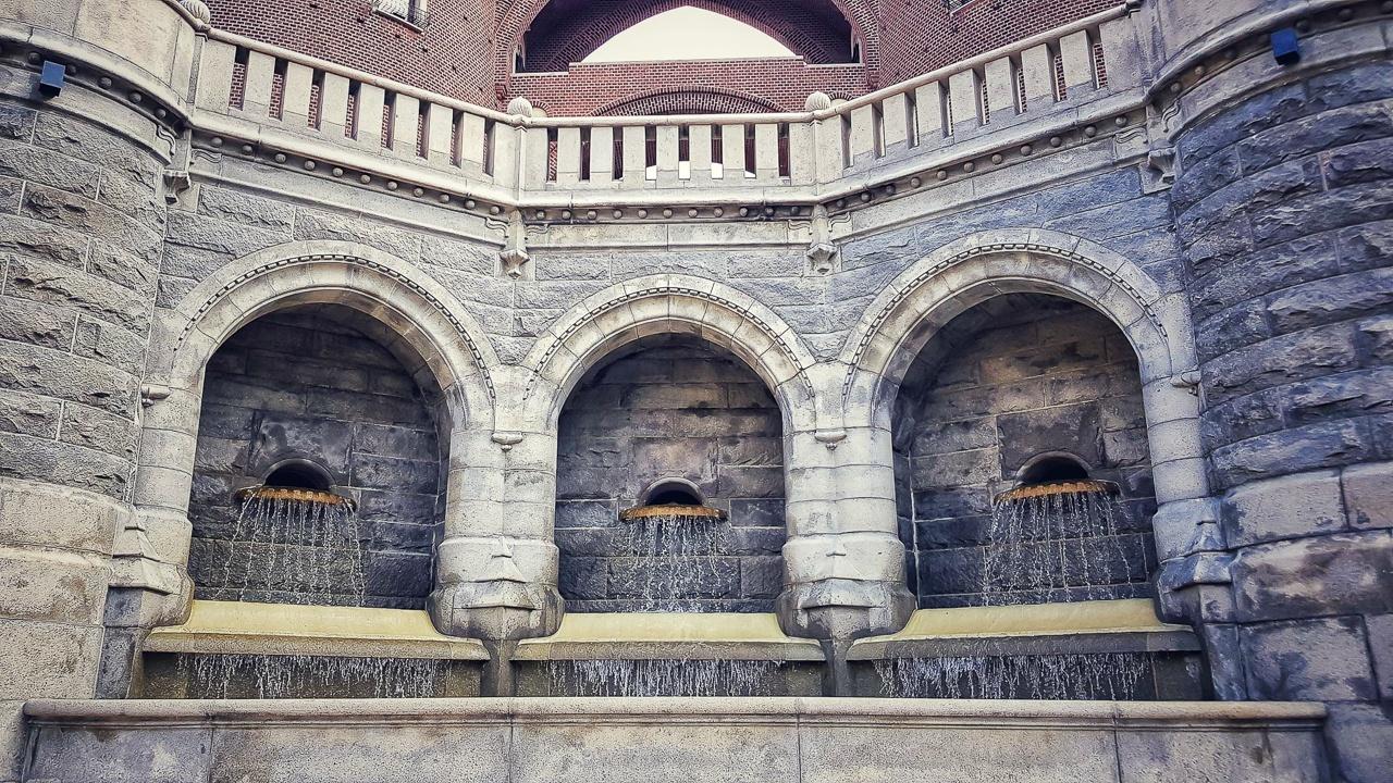 Drei Bögen mit Wasserfällen aus Steinmauerwerk und darunterliegendem Becken