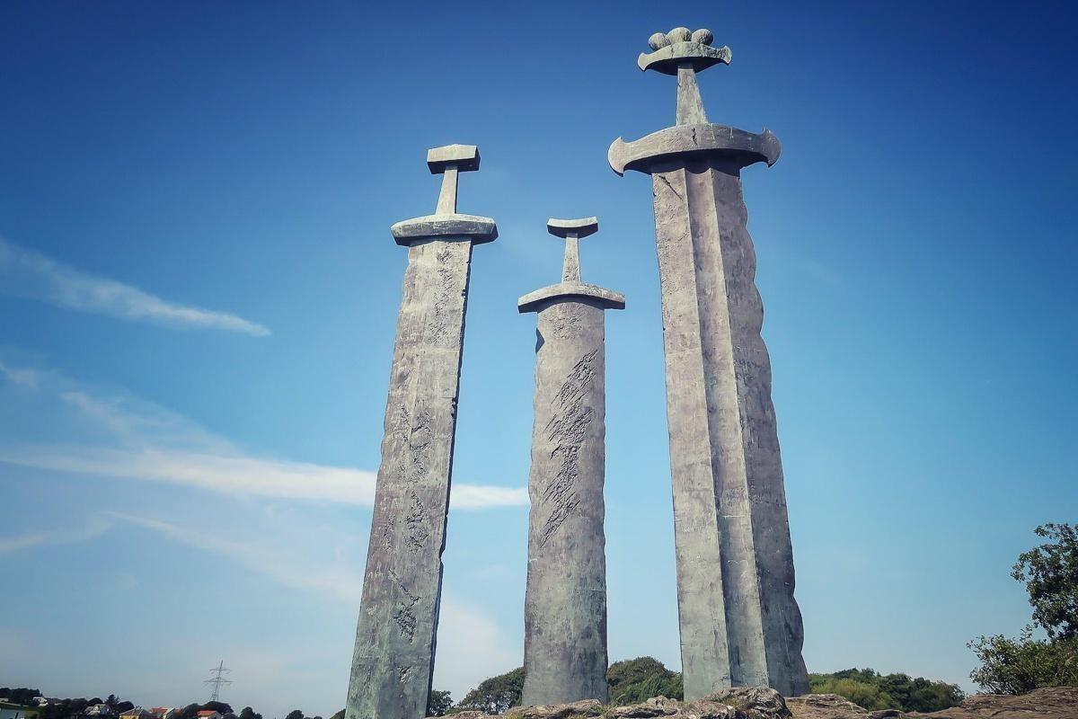 Drei große, stilisierte Schwertskulpturen aus Metall stehen auf einem Felsen