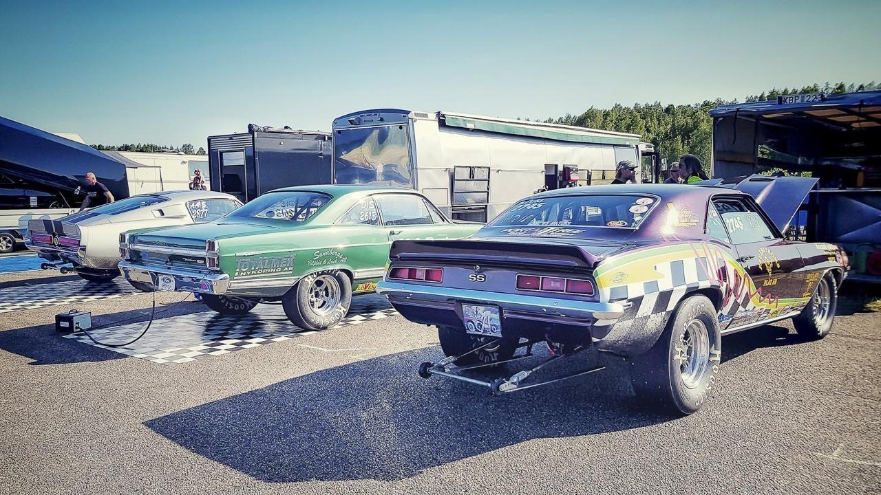 Drei Rennwagen stehen auf einer Rennstrecke, im Hintergrund sind Transportanhänger sichtbar