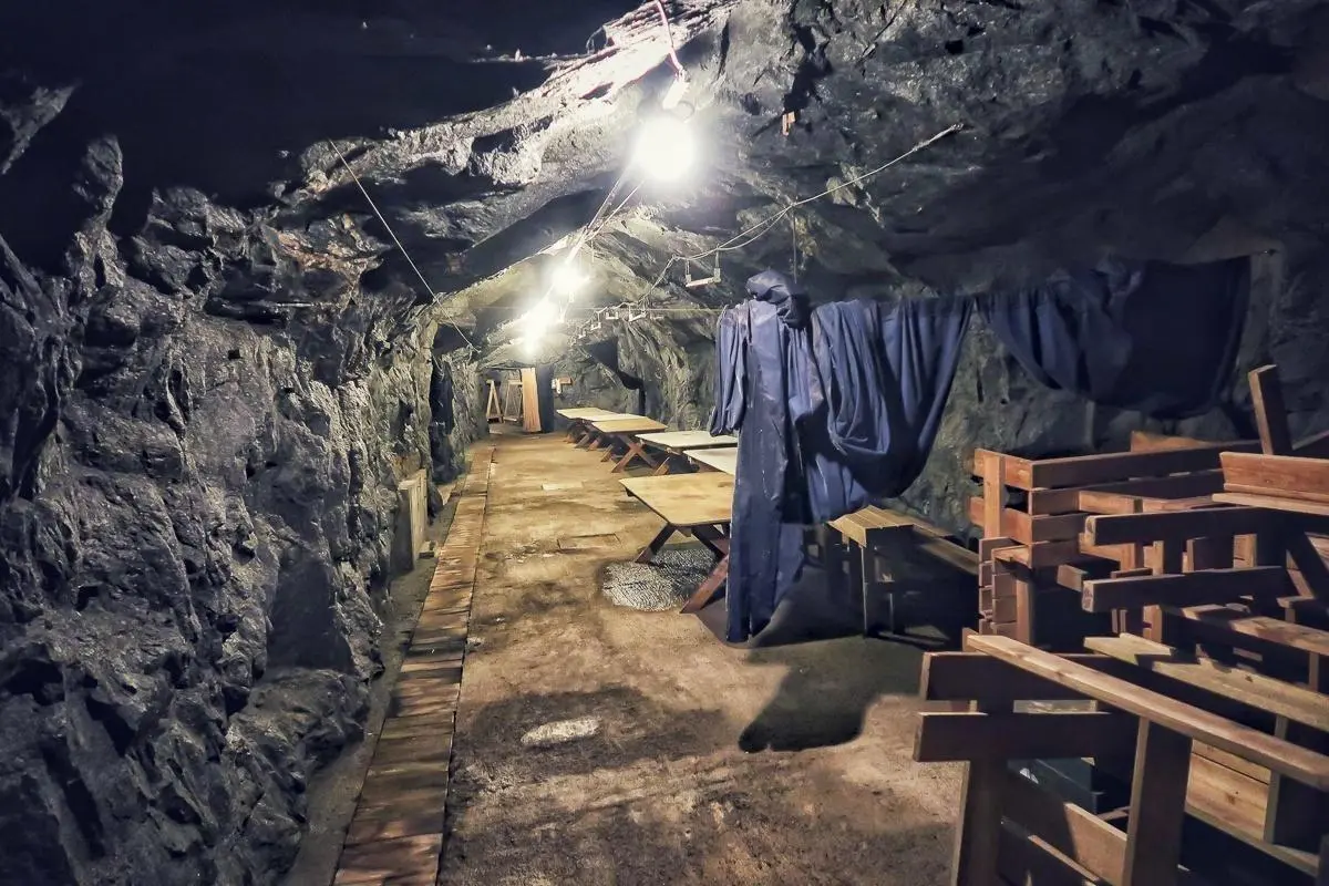 Dunkler Stollen mit Holzregalen und hängenden Vorhängen, beleuchtet von Deckenlampen