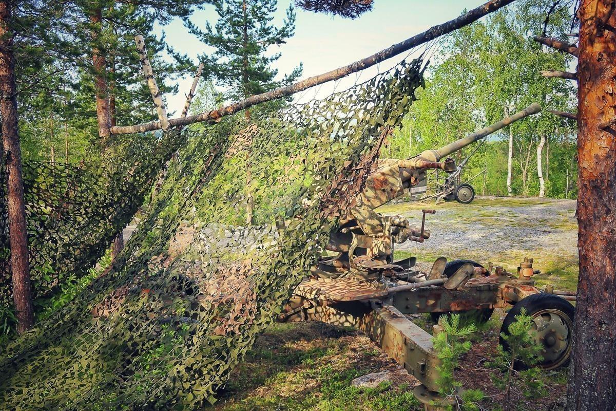 Ein camouflage Netz verdeckt eine alte Kanone zwischen Bäumen