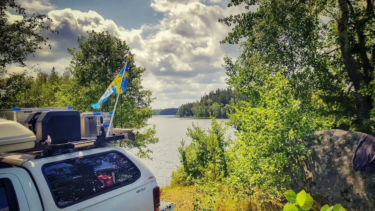 Ein Fahrzeug steht am Ufer eines Gewässers, umgeben von Bäumen und Felsen