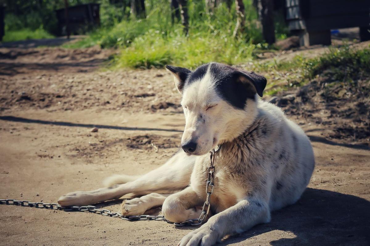 Ein Hund liegt entspannt auf dem Boden, an einer Kette befestigt