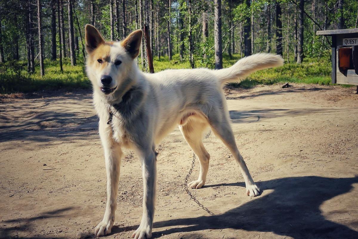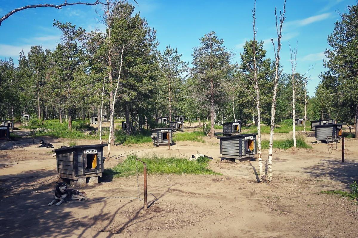 Hundehäuser stehen in einem bewaldeten Bereich mit Gras und Sandboden