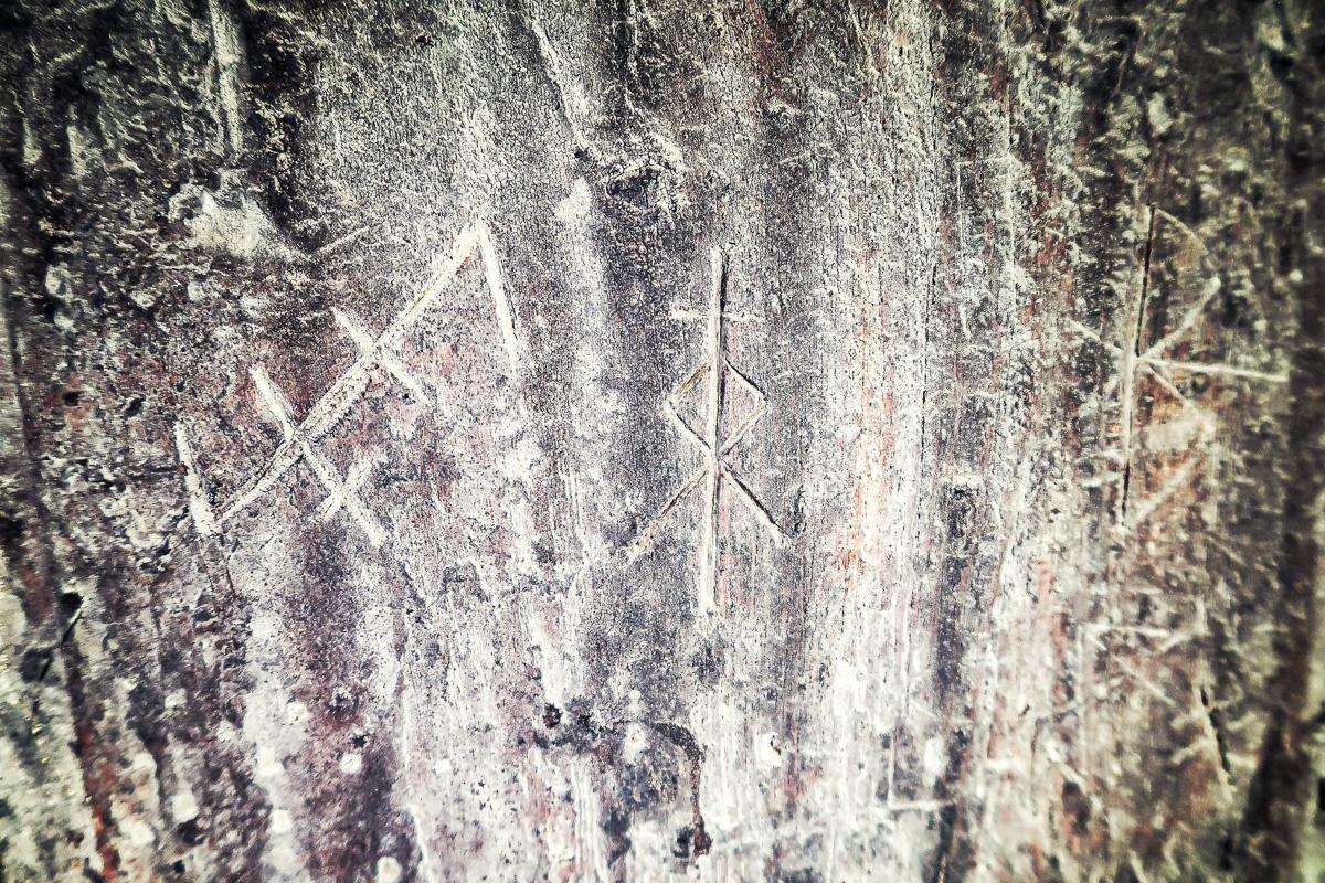 Eingravierte Symbole auf einer rauen Steinoberfläche