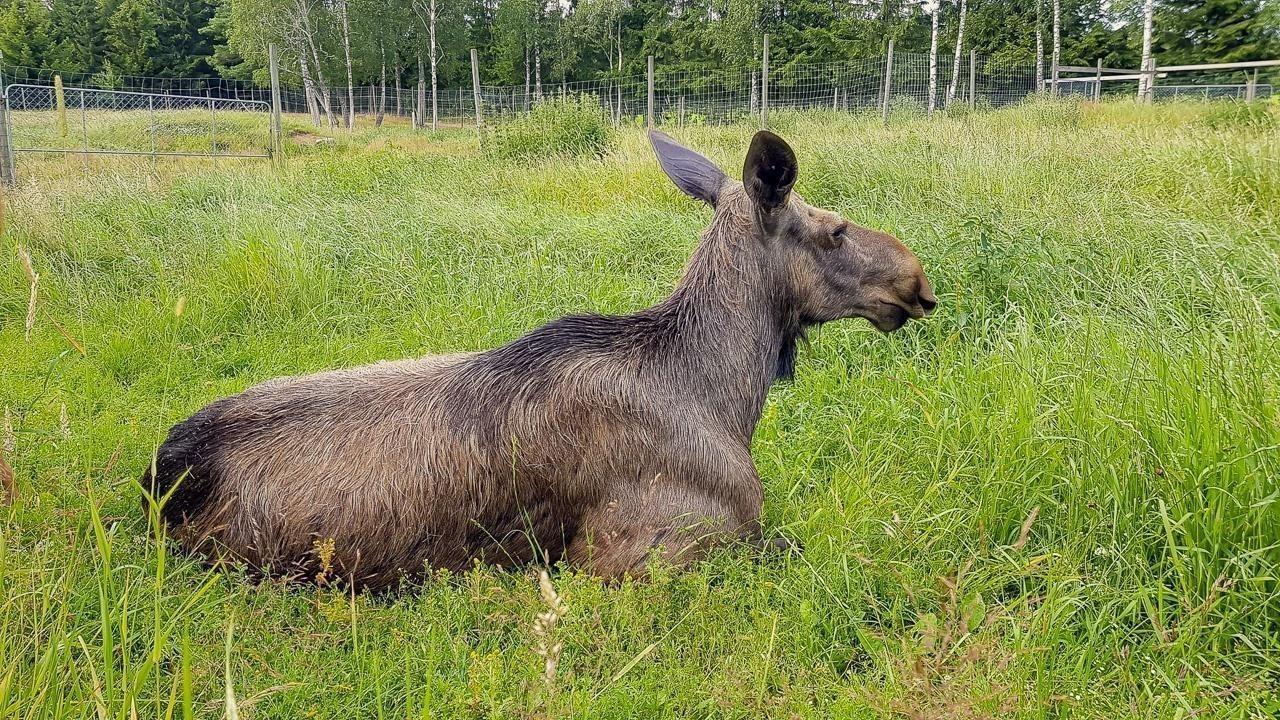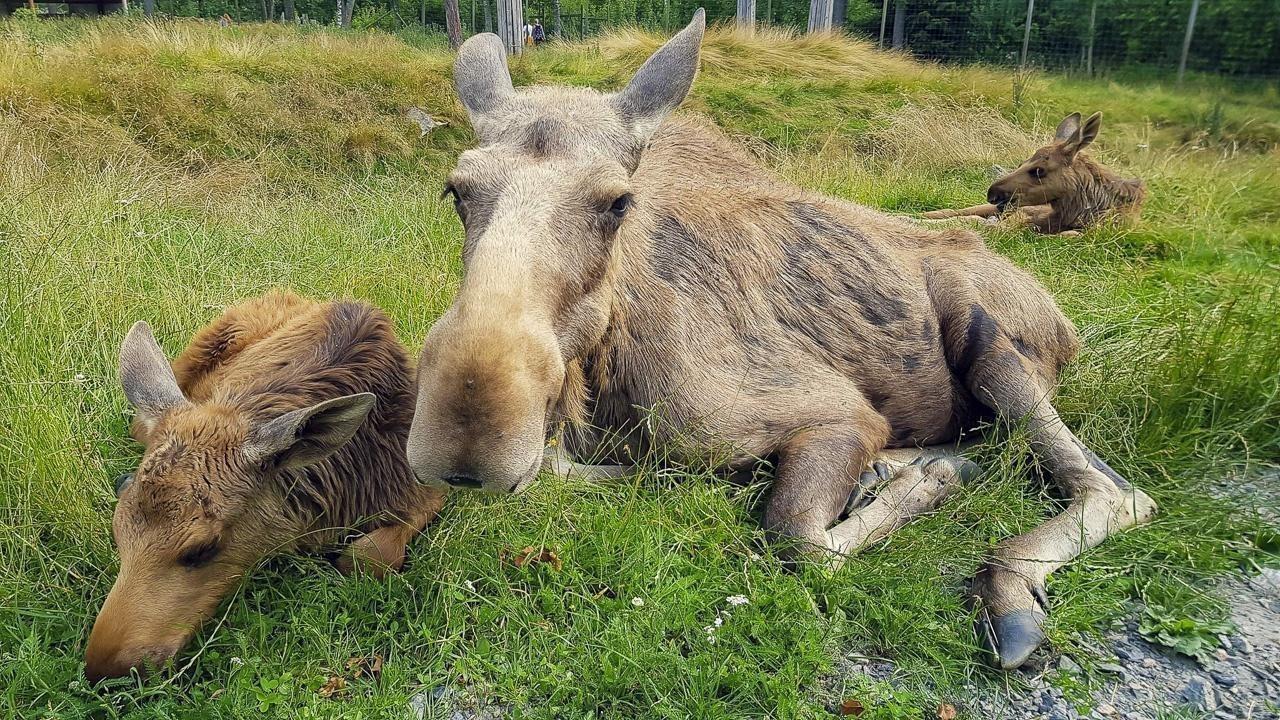 Zwei Elche liegen im Gras, ein Jungtier ruht neben einem ausgewachsenen Tier