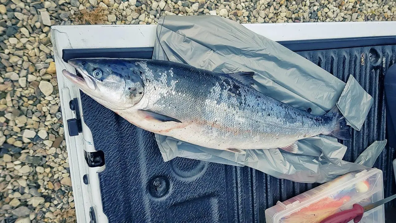 Frischer Fisch liegt auf einer Plane im Laderaum eines Fahrzeugs
