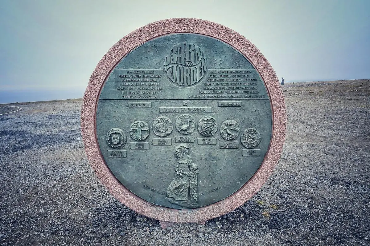 Metalltafel mit Inschrift über den Leuchtturm Lindesnes Fyr in Norwegen