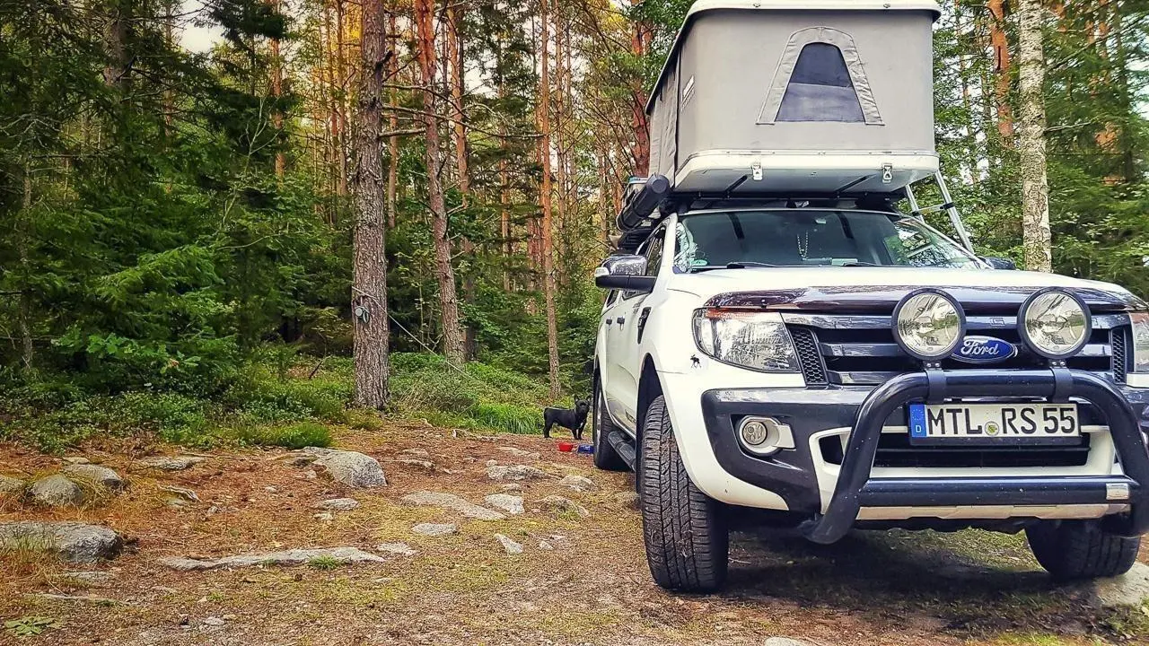 Geländewagen mit Dachzelt steht auf einem Waldweg zwischen Bäumen