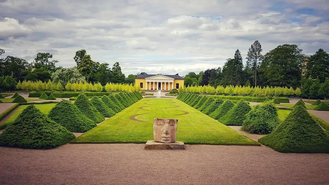 Gepflasterter Garten mit geometrischen Hecken und einem Skulpturenkopf im Vordergrund