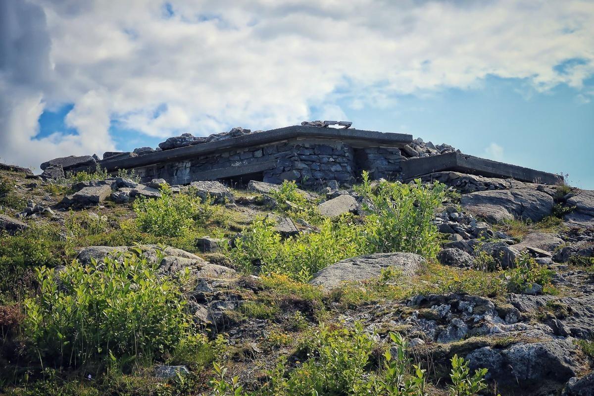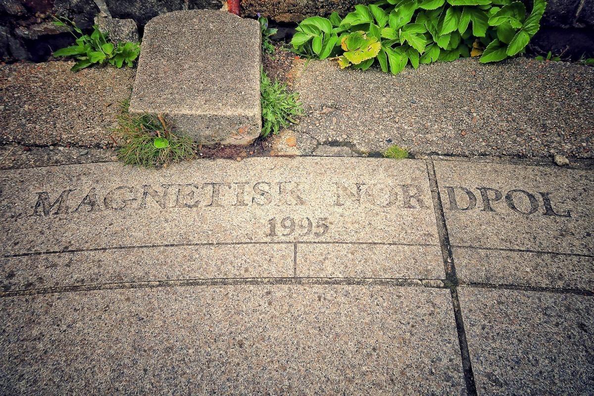 Granitplatte mit eingravierter Inschrift „MAGNETISK NORDPOL 1995“ und umgebender Vegetation