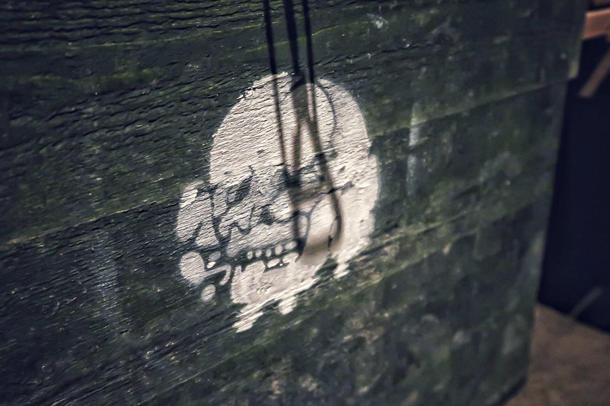 Graue Wand mit einem weißen Totenkopf-Symbol und Schattenwurf
