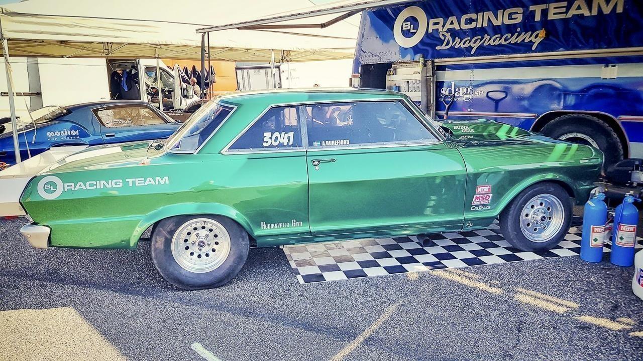 Grünes Drag-Rennfahrzeug steht auf einem schwarz-weißen Schachbrettmuster