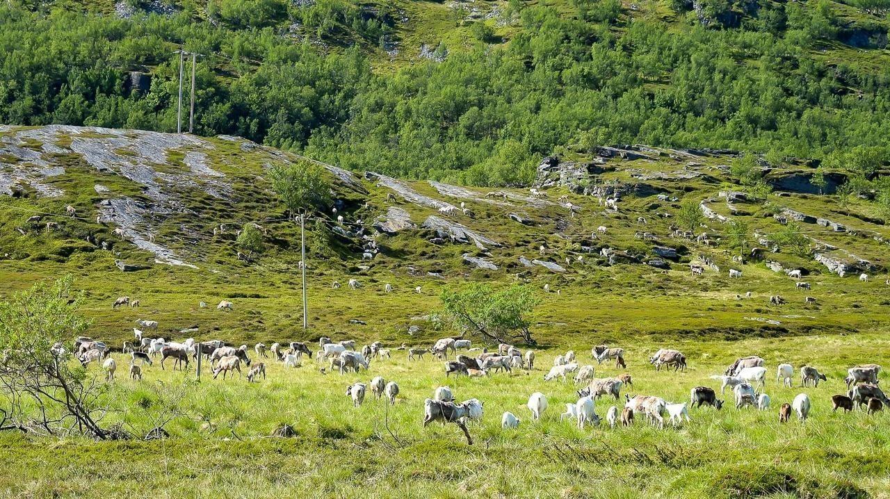 Gruppe von Rentieren weidet auf einer grünen Wiese mit Felsen im Hintergrund