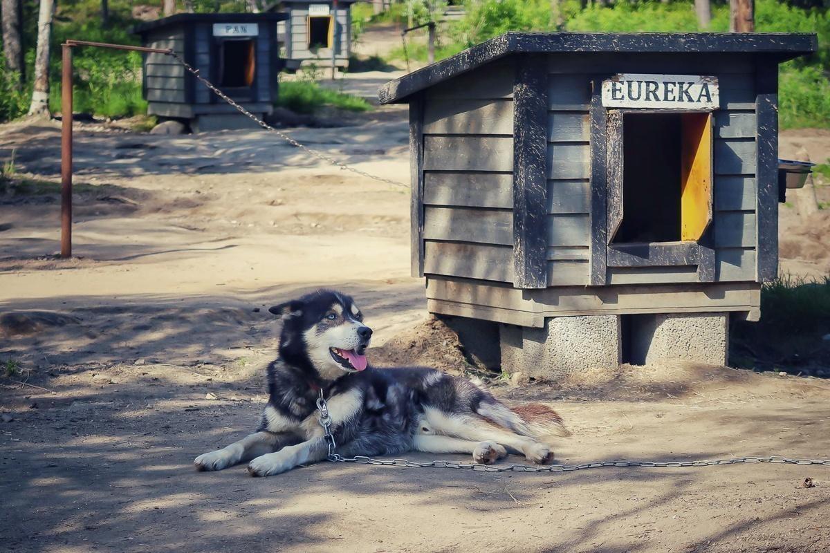Husky liegt entspannt an einer Hundehütte mit der Aufschrift „Eureka“