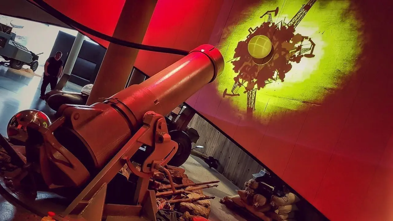 Panzerabwehrwaffe mit einem großen Geschoss und zwei Rädern in einer Ausstellung