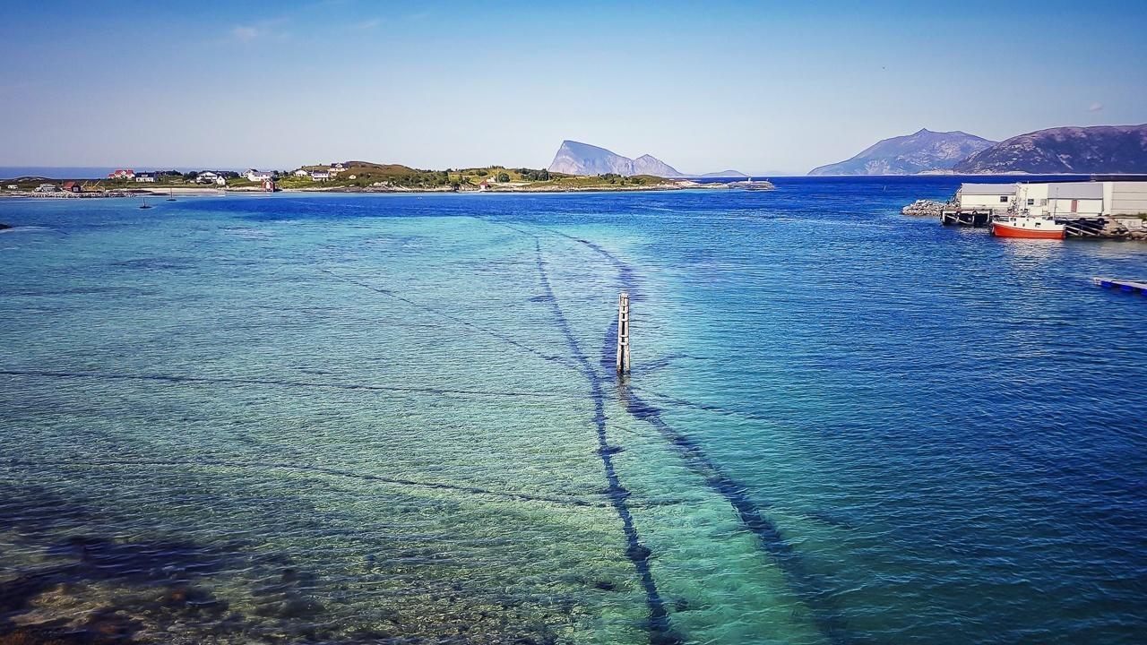 Klares Wasser mit sichtbaren Spuren und einem Pfahl im Vordergrund
