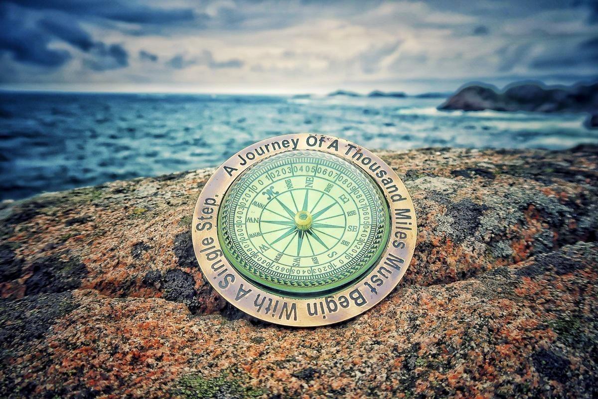 Kompass liegt auf einem Felsen mit Blick auf das Meer