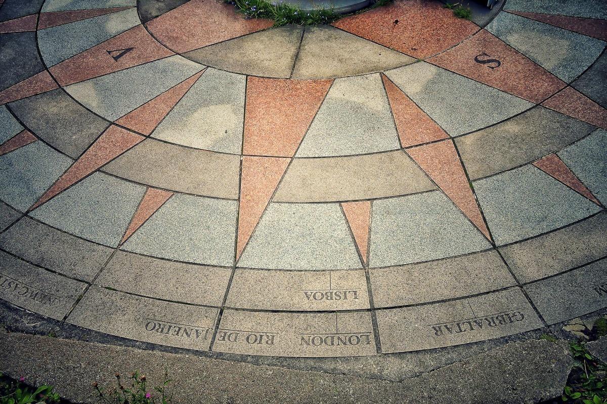 Kompassrose aus Stein mit verschiedenen Himmelsrichtungen und Städtenamen
