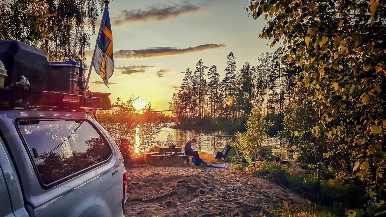Lagerfeuer brennt am Ufer eines Sees, während ein Fahrzeug im Vordergrund steht