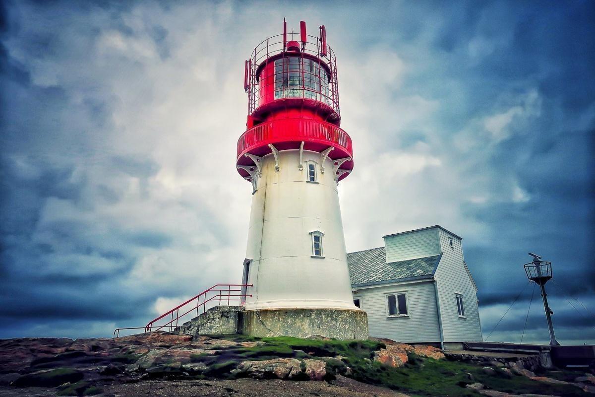 Leuchtturm mit rotem Oberteil und angrenzendem Gebäude auf felsigem Untergrund