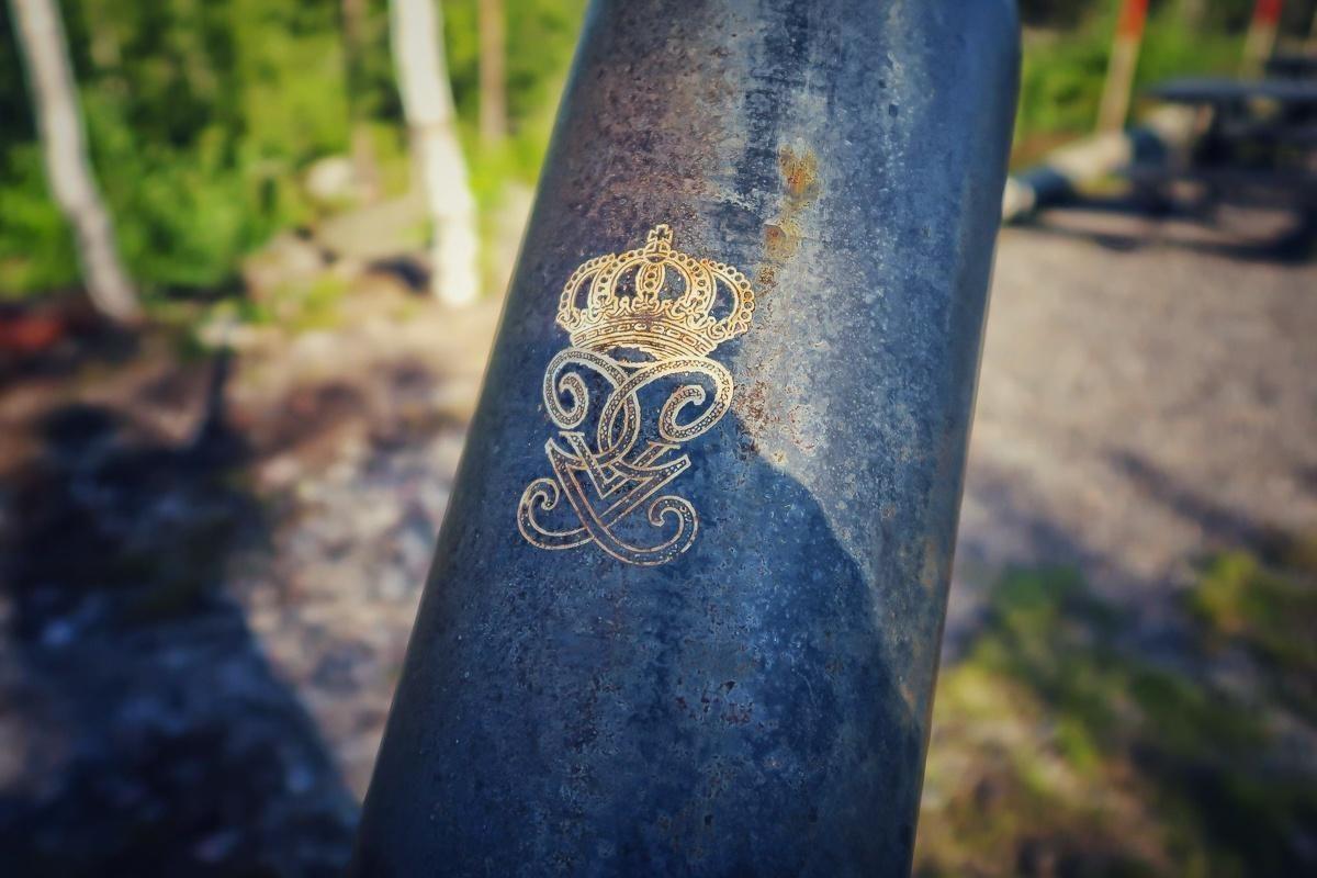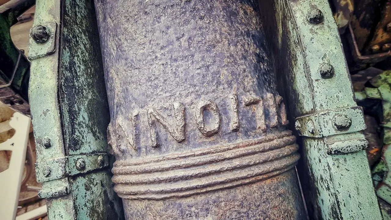 Detailaufnahme eines Kanonenrohrs mit eingraviertem Wappen und Jahreszahl