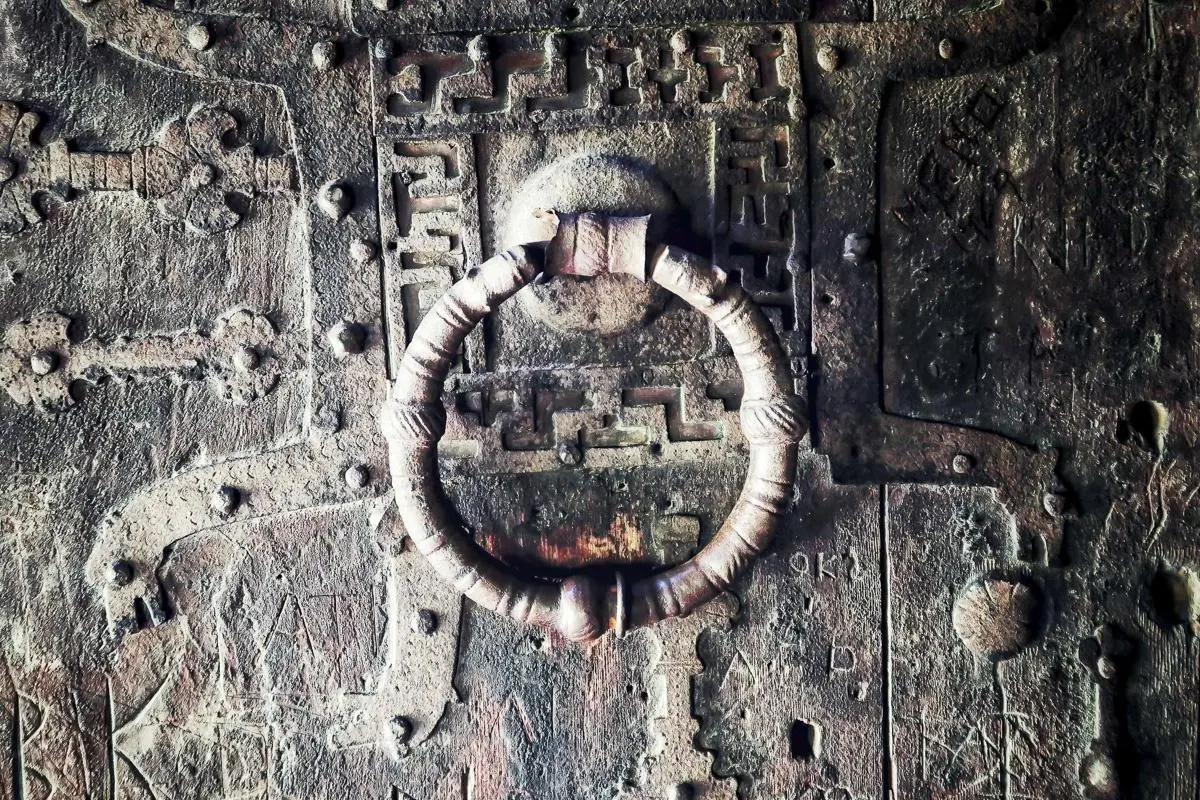 Metallring an einer alten, verzierten Holztür mit eingravierten Mustern