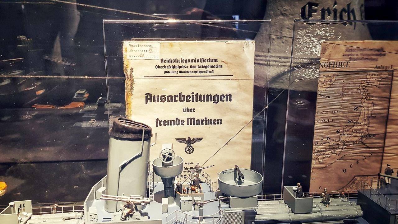 Modell eines Schiffes mit Dokumenten über fremde Marinen im Hintergrund