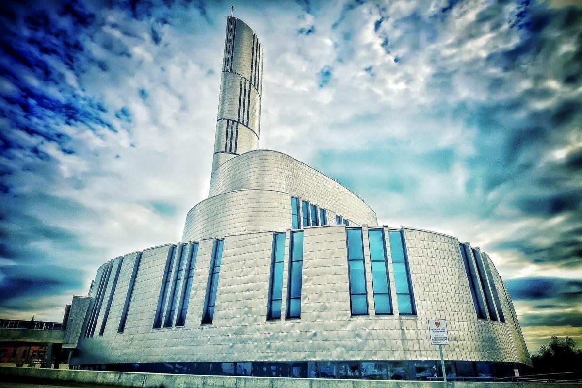 Moderne Architektur mit geschwungener Fassade und hohem Turm unter bewölktem Himmel