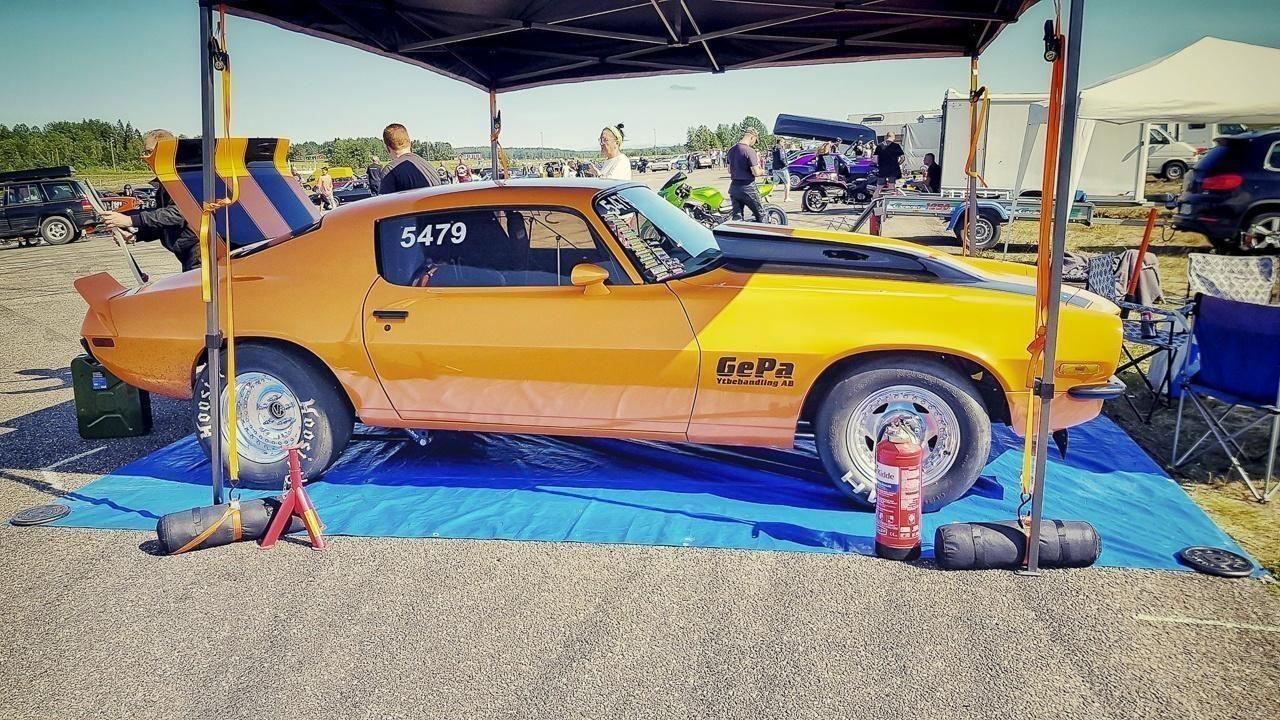 Orangefarbener Rennwagen steht unter einem Zelt auf einer blauen Plane