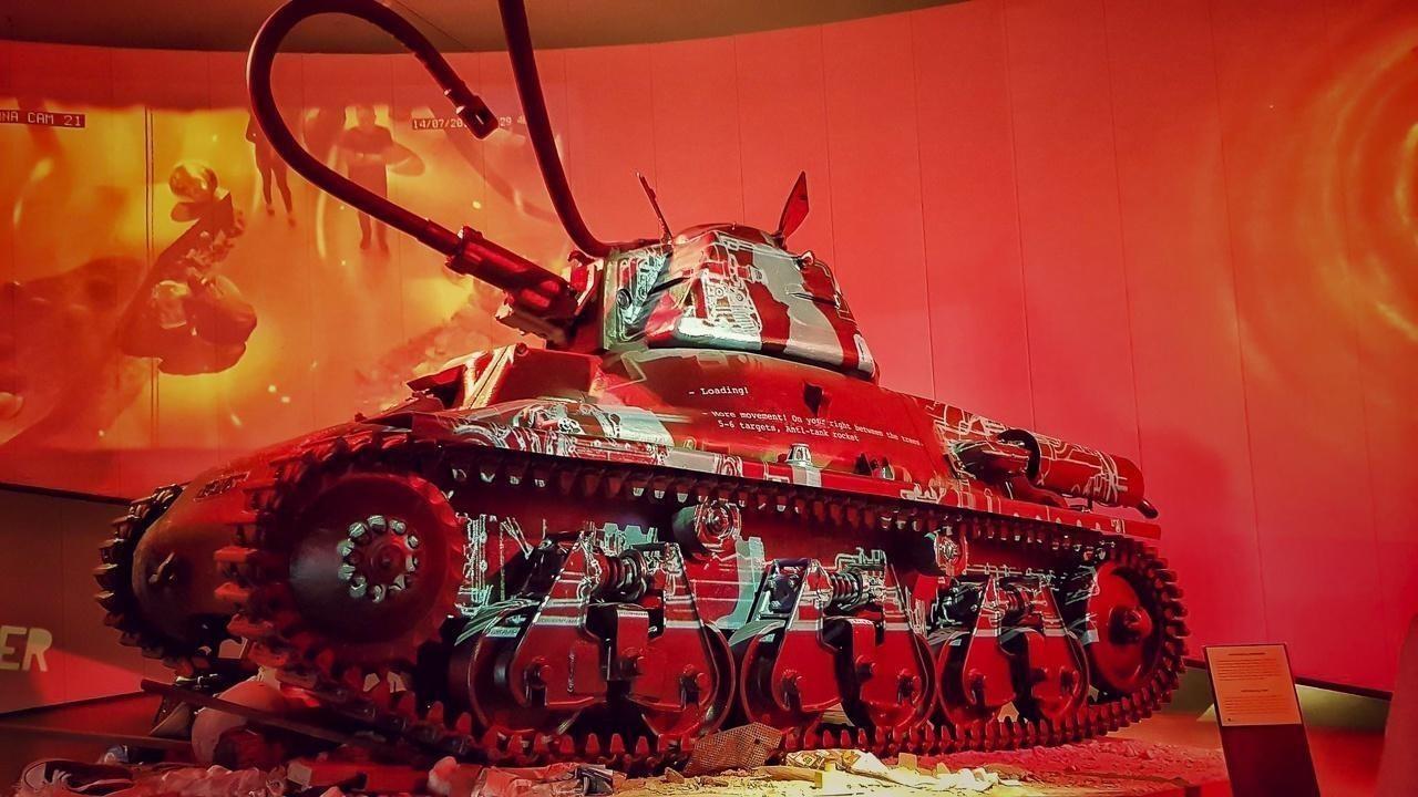 Panzer mit Kettenantrieb und auffälliger Lackierung in einem Ausstellungsraum