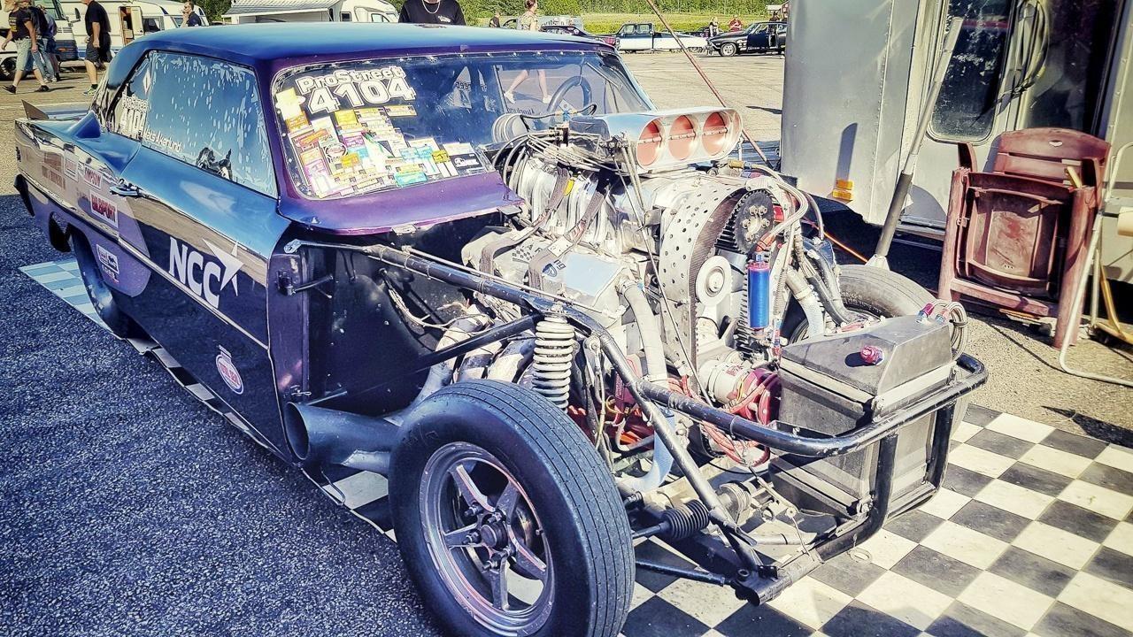 Renntuning-Auto mit offenem Motorraum und sichtbarem Turbolader auf einer Rennstrecke
