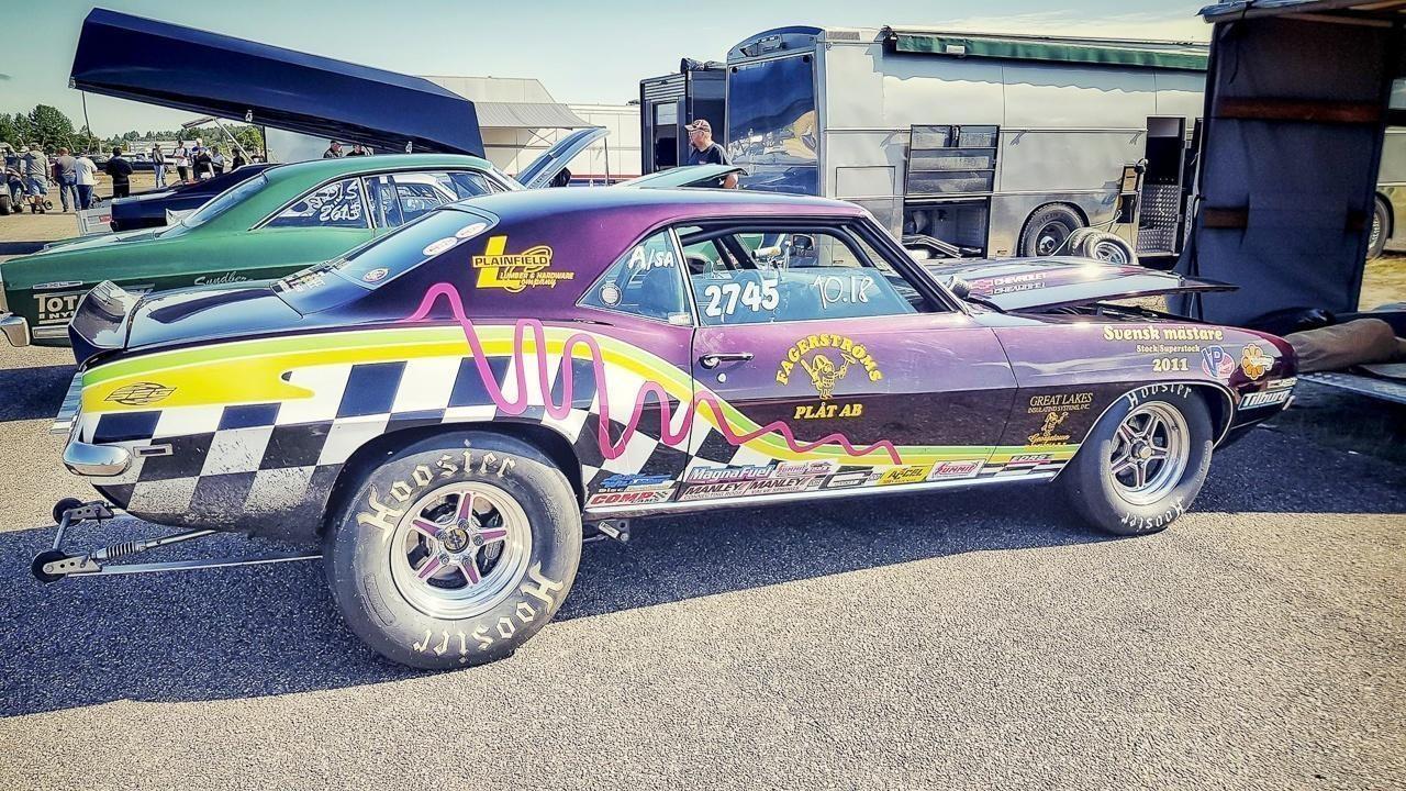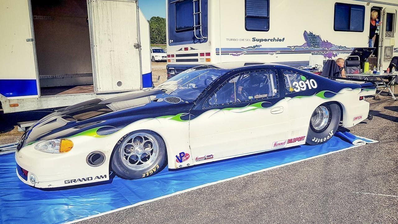 Rennwagen mit auffälligem Design steht auf einer blauen Plane neben einem Wohnmobil