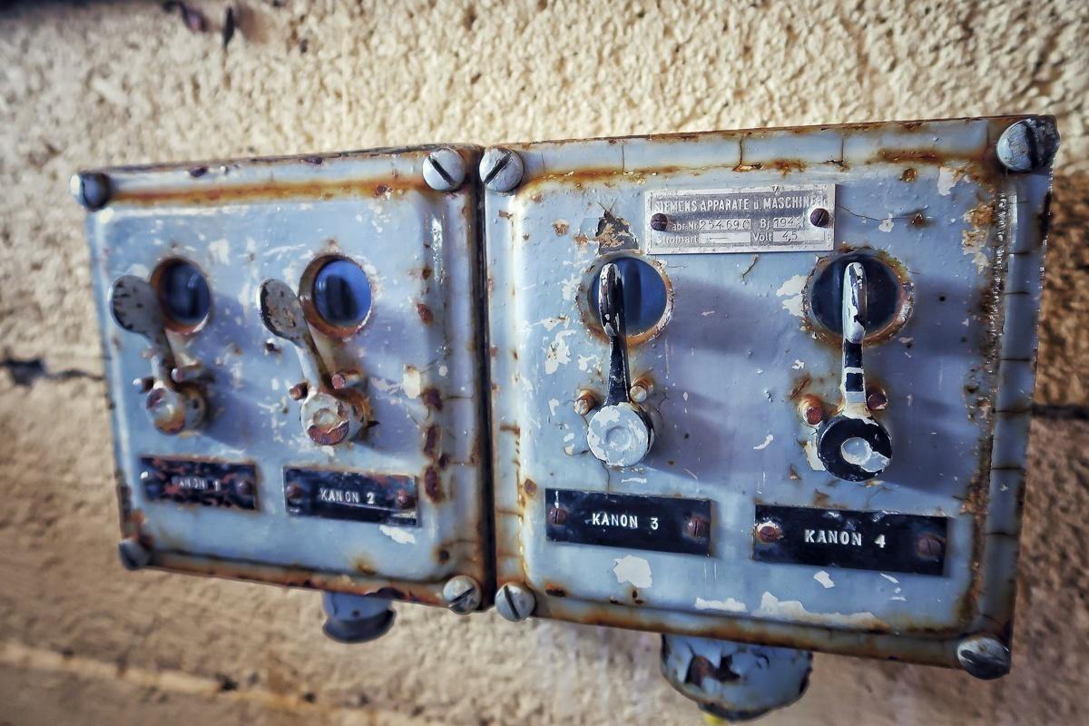 Rostige Schaltkästen mit Hebeln an einer Wand montiert