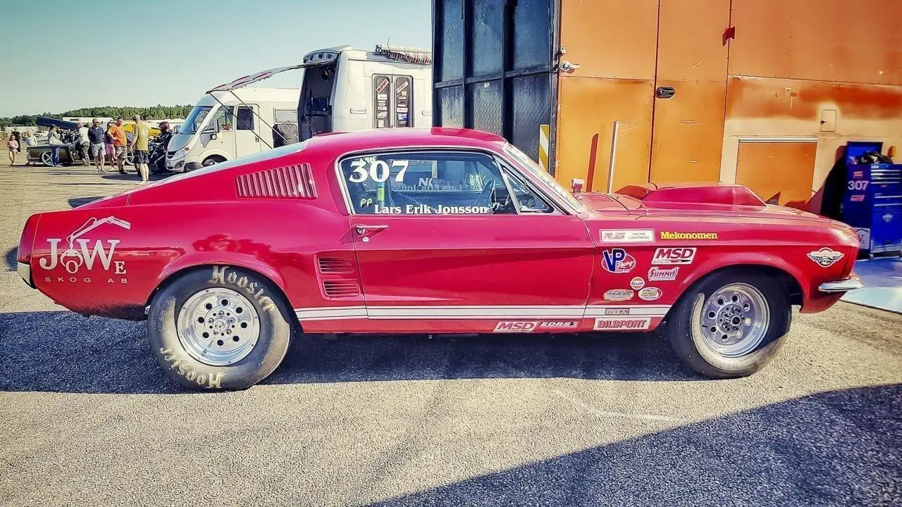 Rotes Rennfahrzeug mit breiten Reifen steht auf asphaltierter Fläche