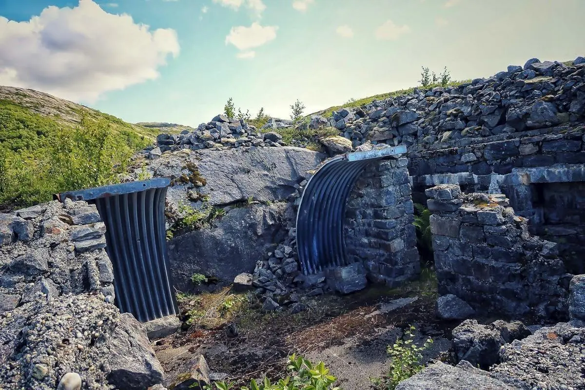 Ruinen mit Steinmauern und Metallteilen in einer bewachsenen Landschaft