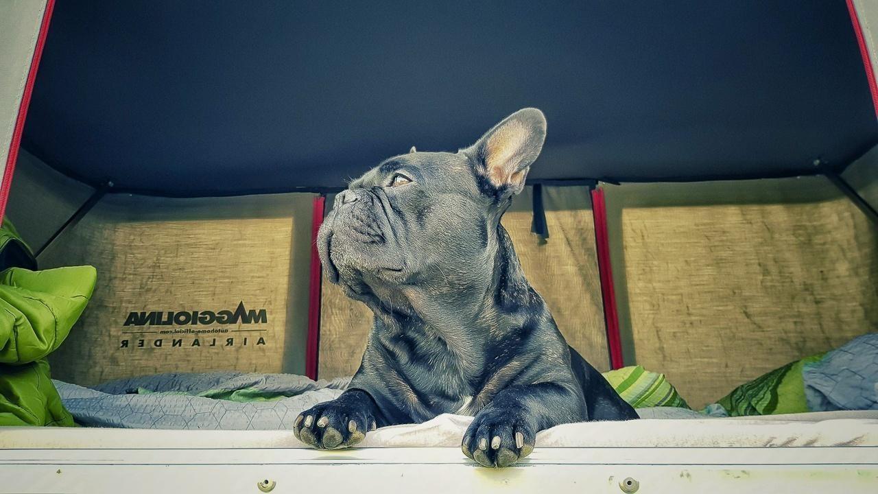 Schwarzer Hund liegt auf einer Liege in einem Zelt und schaut nach draußen