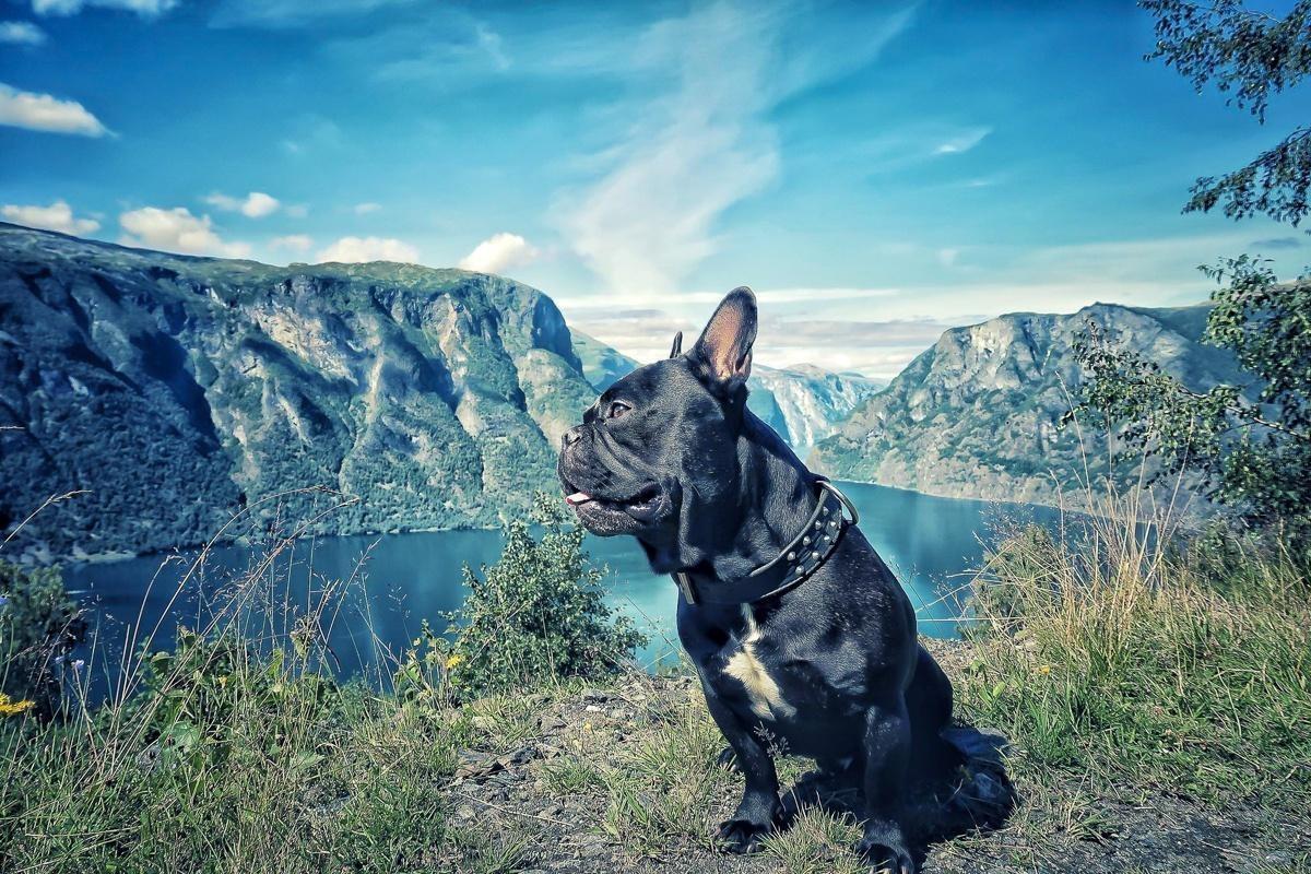 Schwarzer Hund sitzt auf einem Hügel mit Blick auf einen Fjord und Berge