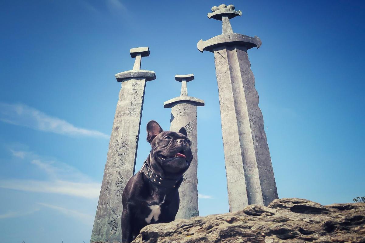 Schwarzer Hund sitzt vor drei großen, aufrechten Schwertskulpturen