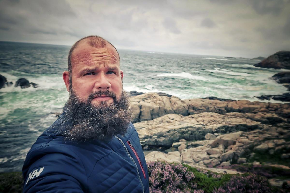 Selbstporträt vor einer felsigen Küstenlandschaft mit Wellen und bewölktem Himmel
